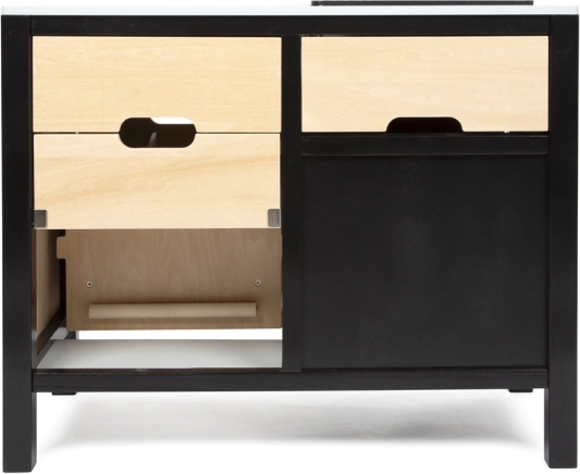 Elegantna kombinacija črnega okvirja in naravnega lesa doda otroški sobi moderen pridih. Samostojni otok lahko priključite h kuhinji in ustvarite kotno rešitev – prilagodljiv igralni prostor po meri.