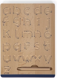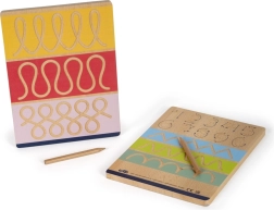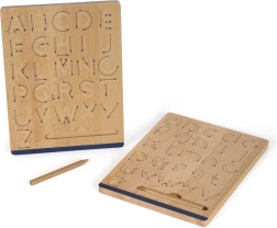 Komplet small foot Educate je idealen pripomoček za predšolske otroke in mlajše šolarje, ki se učijo prvih potez. Dve obojestranski leseni deski prinašata štiri različne vaje: črke, številke in predpisovalne vzorce. Vodenje po izklesanih žlebovih s puščicami naravno uči pravilnega zaporedja potez in podpira mišični spomin roke.