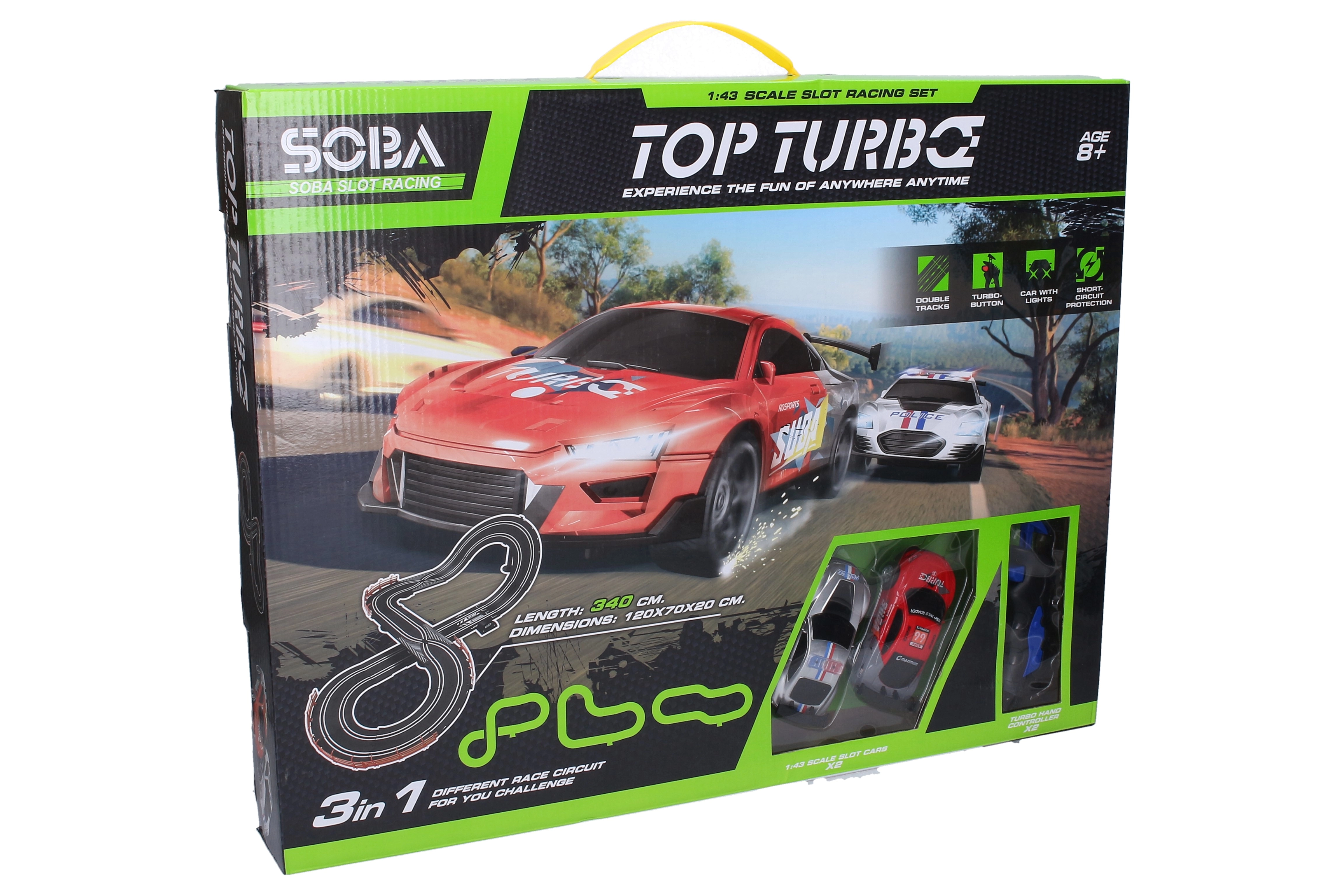 Zasukajte v akcijsko vožnjo z dinamično avtocesto, kjer se spopadeta policija in ropar. Uživajte v hitri dirkalni progi dolžine 340 cm, 3 možnostih postavitve in 2 avtomobilčkih z osvetljenimi lučmi za še več zabave. Idealna izbira za otroke od 8 let naprej in igrive odrasle.