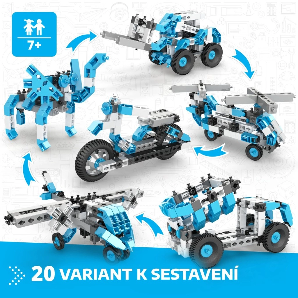 Konstrukcijski set Engino Box 20 modelov prinaša otrokom od 7 let ure zabavnega odkrivanja principov konstrukcije in inženirstva. Iz enega seta boste zgradili avtomobile, motorje, letala, helikopterje, robote in živali – vse z realističnimi detajli in funkcijami za domiselno igro. Deli so trdni, lahki in zasnovani za udobno sestavljanje.