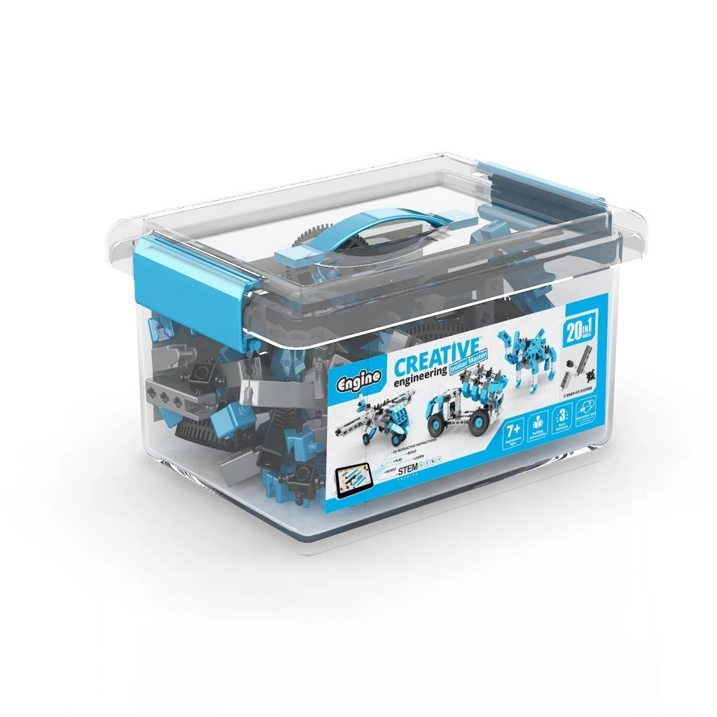 Odkrijte vsestranski konstrukcijski set ENGINO z do 20 modeli v enem priročnem boksu. Set za otroke od 7 let podpira kreativnost, STEM učenje in fino motoriko. Deli v modri, beli, črni in sivi barvi se zlahka povezujejo in večkratno preoblikujejo. Del paketa je interaktivna aplikacija kidCAD za 3D prikaz, vrtenje in prilagajanje modelov. Shranjeno v prozornem boksu s pokrovom in ročajem za enostavno prenašanje in red.