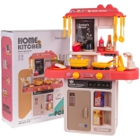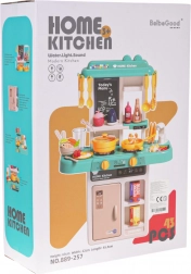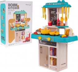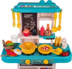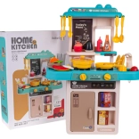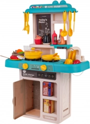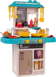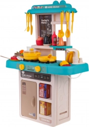 Ta otroška kuhinjica v trendovskih modro–turkiznih odtenkih spremeni sobo v mali bistro. Interaktivna kuhalna plošča po zasuku gumbov oddaja zvoke kuhanja in pečenja ter hkrati osvetli gorilnike. Iz pipe resnično teče voda, zato lahko otroci po “kuhanju” splaknejo posodo kot v pravi kuhinji.
