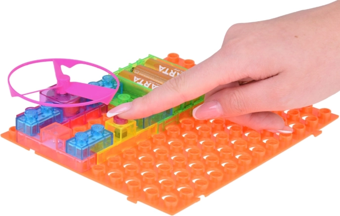Odkrijte zabavno pot v svet elektronike s tem izobraževalnim kompletom za otroke od 8 let. Sestavite do 120 projektov iz barvnih modulov na osnovni plošči in razumite, kako deluje električno vezje. Vključene so komponente, kot so LED-diode, motor z eliso, zvočnik, stikala in povezovalni elementi – vse zasnovano za varno in učenje skozi igro.