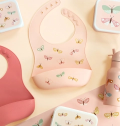 Igriv motiv metuljčkov v kombinaciji z nežno enobarvno različico polepša vsak obrok in se lepo ujema z otroškim posodjem.