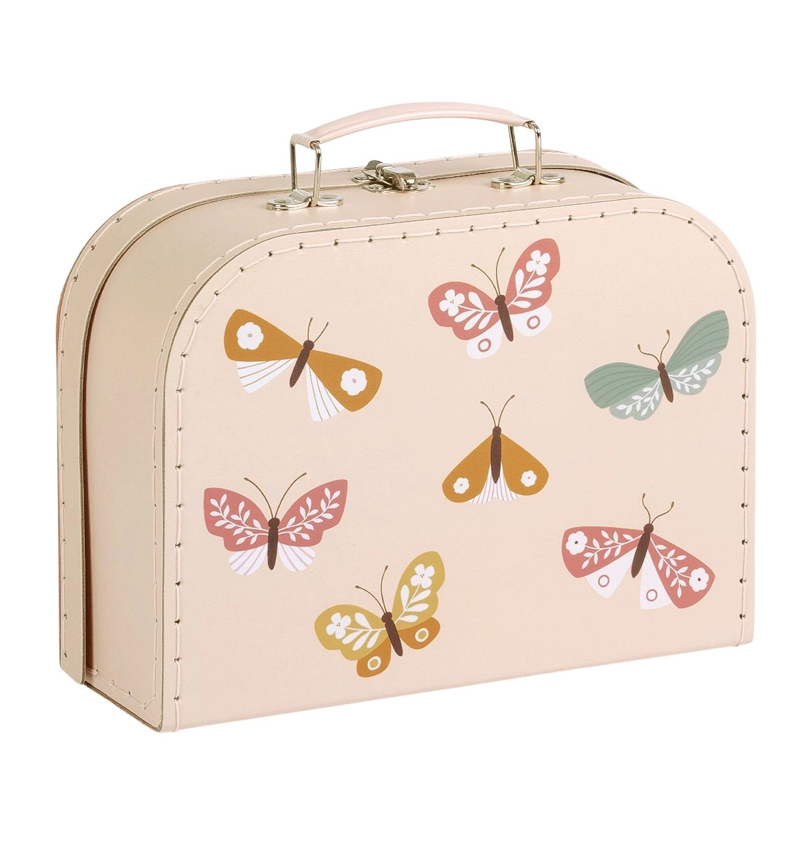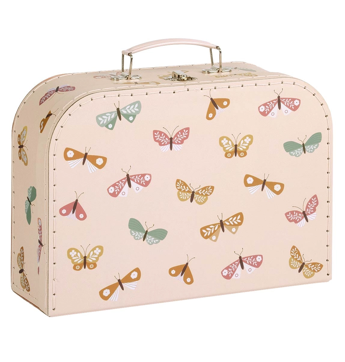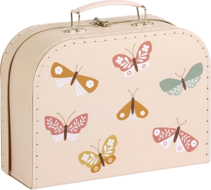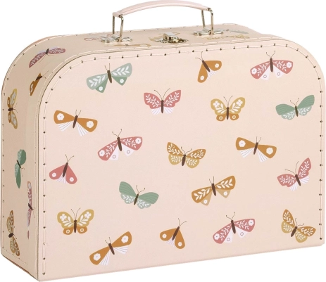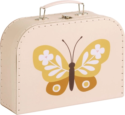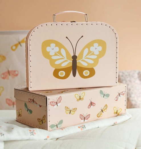Praktičen in stilski komplet dveh kovčkov v nežnem bež odtenku z barvitimi ilustracijami metuljev prinese red in veselje v vsakdanjo rabo. Večji in manjši kovček služita za igrače, barvice, zvezke, male zaklade ali kot dekorativni shranjevalni škatli v otroški sobi.