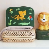 Odkrijte stilsko in funkcionalno shranjevanje za otroške zaklade. Dvojica kovčkov z veselim motivom tigra iz džungle je odlična za otroško sobo, obiske in potovanja. Zaradi čvrste izdelave preneseta vsakodnevno uporabo in hkrati lepo dopolnita interier.
