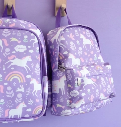 Prsni trak pomaga, da naramnice ostanejo na ramenih, zato nahrbtnik bolje stoji tudi pri teku in igri. Barvit potisk s samorogi in mavrico naredi nahrbtnik za stilskega spremljevalca malih pustolovcev.