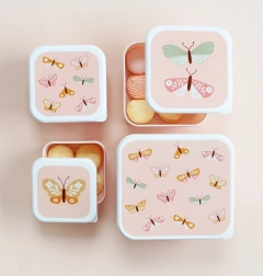 Komplet je zasnovan za pregledno in higiensko shranjevanje hrane. Posamezne škatlice imajo enak igriv motiv metuljčkov in so dimenzijsko prilagojene, da se zložijo ena v drugo, zato doma prihranijo prostor. Odlične so za sadje, piškote, sendvič in drobne prigrizke.