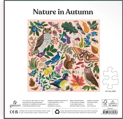 Odkrijte čar jeseni z dizajnersko sestavljanko s 500 koščki znamke GALISON. Ilustracija umetnice Christine de Carvalho prikazuje bogato favno in floro v toplih jesenskih barvah. Sestavljanka ponuja zabaven izziv za vso družino, po sestavljanju ustvari elegantno sliko, primerno za razstavo, in je izdelana iz materialov s certifikatom FSC z netoksičnimi črnili.