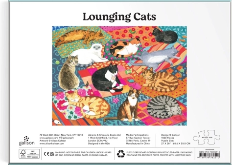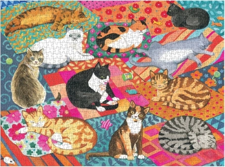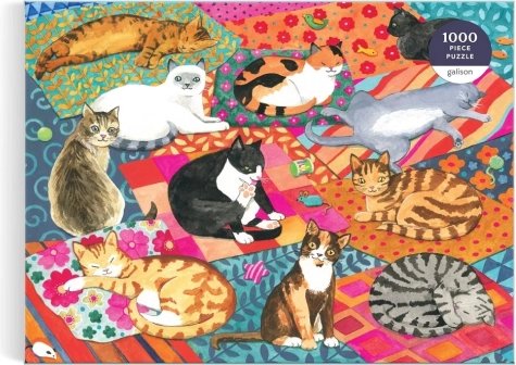 Uživajte v sprostitvi s čudovitimi sestavljankami GALISON z motivom ilustratorke Alison Kolesar. Sestavljanka s 1000 koščki prikazuje ljubke mačke na barvitih odejah in blazinah, izdelana je iz recikliranih materialov, z mat zaključkom, netoksičnimi črnili in vrhunskim tiskom za žive barve in podrobnosti.