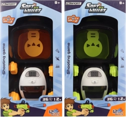 Ta komplet je idealen za otroke in mlade strelce, ki radi preizkušajo svoje spretnosti in natančnost. Tarča v obliki dinozavra ima vgrajen števec na baterije, ki prikazuje rezultat in izdaja zvočne efekte ob vsakem zadetku.