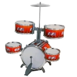Vsebuje veliki bas boben z nožno pedalo, dva mala in dva srednja bobna, činelo, plastični paličici in stolček. Odličen za male glasbenike.