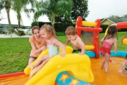 - Multifunkcijska zabava – tobogan, keglji, obroči, koš, pršilni element.
