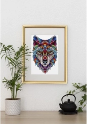 Po sestavljanju dobite pisano volčjo glavo z bogatimi vzorci, ki bo postala izrazit element dekoracije vašega interierja.