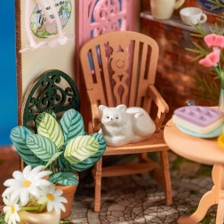 Miniatura je opremljena z natančno izrezanimi elementi, ki vključujejo stol, mizo z vrčem in skodelicami, dekorativne rastline in ograjo.
