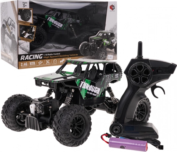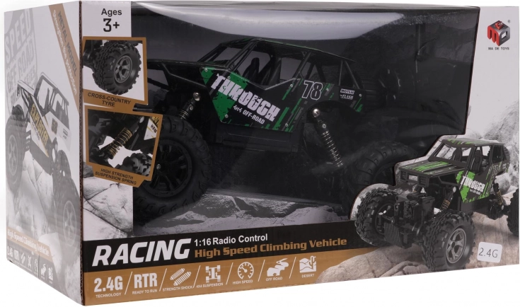Crawler 16: Racing 78 je zabaven, iz trpežne kovine izdelan, daljinsko voden avtomobil v merilu 1:16 s pogonom na vsa štiri kolesa, idealen za otroke od 3. leta dalje. Velike gumijaste pnevmatike in vzmeteno podvozje omogočajo brezskrbno vožnjo po vseh vrstah terena.