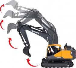 Gradbeni bager Volvo je opremljen z zamenljivimi nastavki – žlico, kladivom in prijemom, ki omogočajo simulacijo različnih gradbenih nalog. Skupaj z vrtenjem za 360° in intenzivno LED osvetlitvijo ponuja neomejene možnosti zabave in učenja.