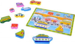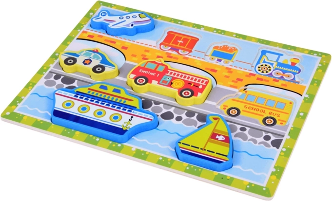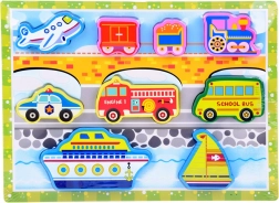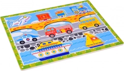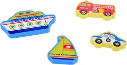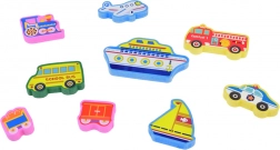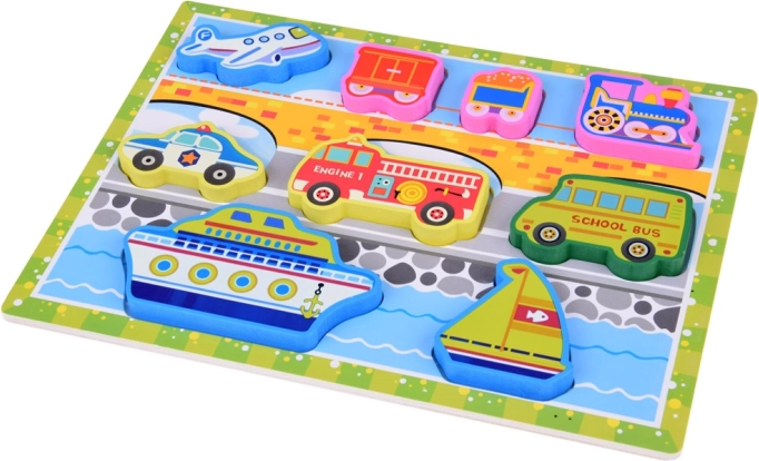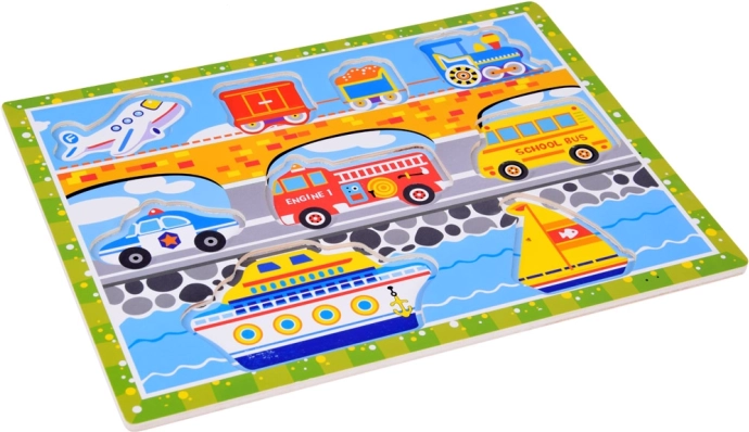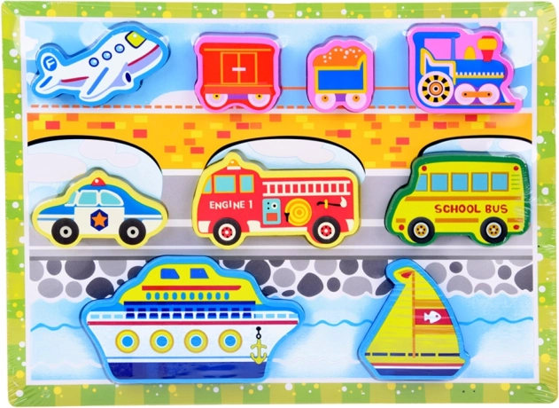 Vsebuje različna prevozna sredstva, kot so šolski avtobus, gasilsko vozilo, letalo in druga.