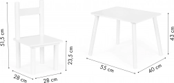 Miza: 55 × 40 × 43 cm. Stol: višina 51,5 cm, širina 28 cm, višina sedala 23,5 cm. Ergonomija za udobje in pravilno sedenje otrok od 3 let.