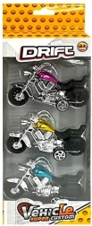 Ta komplet treh realističnih mini motorčkov ponuja veliko zabave in možnost razširiti zbirko. Zaradi kombinacije kovinskih in plastičnih delov so modeli čvrsti, trpežni in navdušijo z bogatimi detajli – od krmila in sedeža do »kromiranih« elementov. Zaradi kompaktnih mer odlično sedejo v otroško roko.