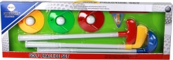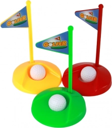 Ta barvit set za minigolf ponuja vse, kar otroci potrebujejo za igro: 3 trpežne palice (pribl. 52 cm), 3 luknje v barvah zelena, rdeča in rumena, 3 začetne zastavice in 3 bele žogice (premer pribl. 3,5 cm). Vsaka palica ima drugačno obliko glave, kar igri doda strategijo in raznolikost.