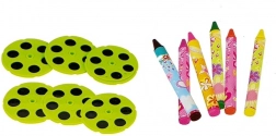 V kompletu je 36 slikovnih šablon, 6 projekcijskih diskov, 12 barvnih kred/pisal ter šablone črk in geometrijskih oblik.
