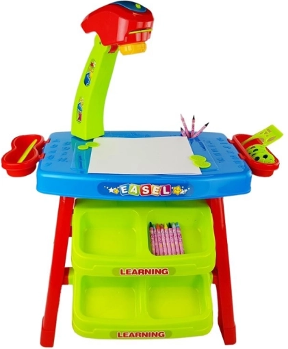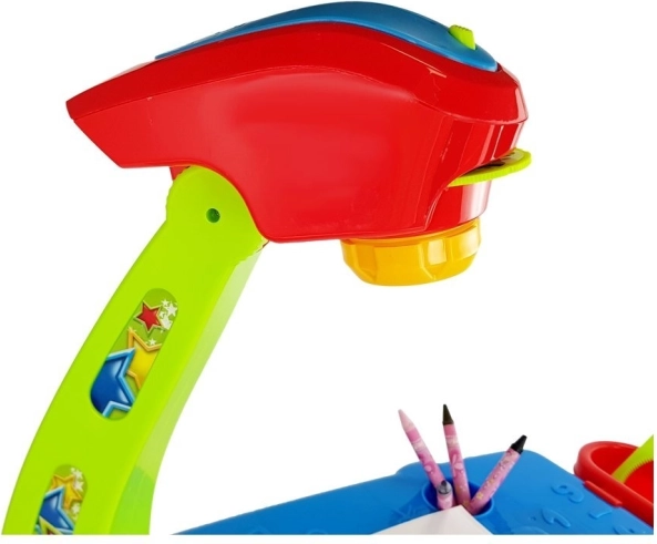 Ta barvita mizica s projektorjem spremeni vsako ustvarjanje v zabavno in izobraževalno doživetje. Le vstavite izbrani disk, vklopite projektor in na papirju formata A4 se prikaže slika s konturami ali v barvi – otrok jo lahko zlahka prepiše in pobarva po predlogi. S šablonami oblik in črk dodatno vadi prepoznavanje geometrijskih oblik in prve zapise črk.