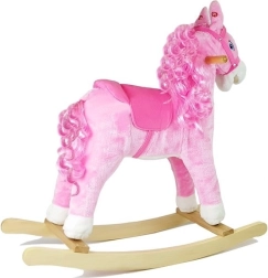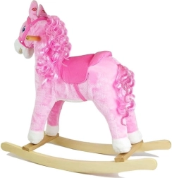 Prisrčen rožnat konjiček za guganje spremeni otroško sobo v svet divjega zahoda. Ponuja mehak plišast površinski material, varne lesene ročaje, udobne stremene in ob pritisku na uho tudi realistično rezgetanje, topot kopit in veselo melodijo. Za še večji užitek konjiček premika gobec in rep, razvija ravnotežje, koordinacijo in domišljijo.