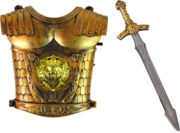 Predstavljamo otroški viteški kostum, ki bo vsakega malega junaka popeljal v čarobni svet pravljic. Zlati oklep z dodatki, kot so ščitniki, ščit in krona, otroku pričara občutek pravega srednjeveškega bojevnika. Vsi deli so izdelani iz kakovostne in varne plastike, ki zagotavlja dolgotrajno in varno igro.