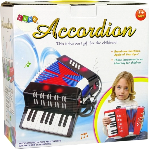Izgleda kot prava harmonika in ob pravilnem delu z mehom ustvarja prijetne melodije – idealno za prve glasbene korake.