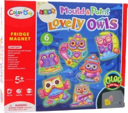 - Kalup z motivi sovic, paket sadre, 6 barv, čopič, samolepilni ploščati magnet (15 × 2 cm), navodila