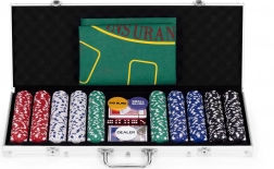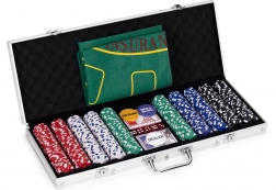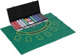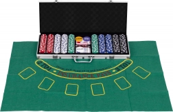 Vsebuje 500 žetonov, 2 kompleta kart, kocke in igralno podlogo. Vse skupaj v praktičnem zaklenljivem kovčku.