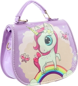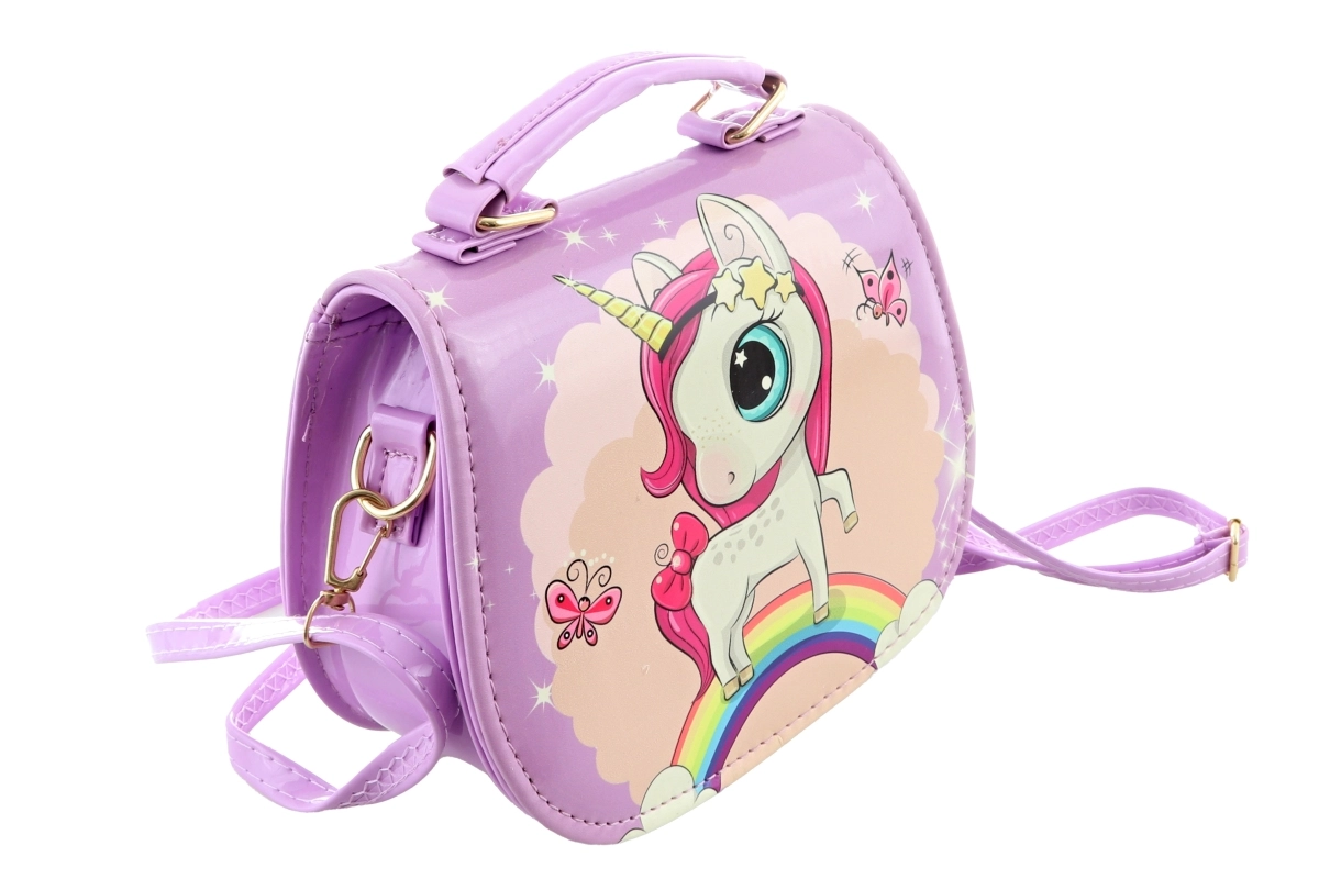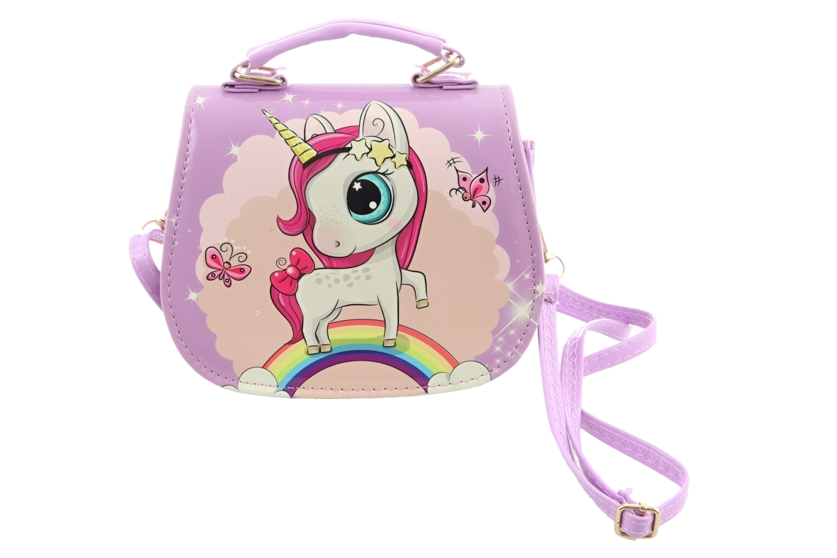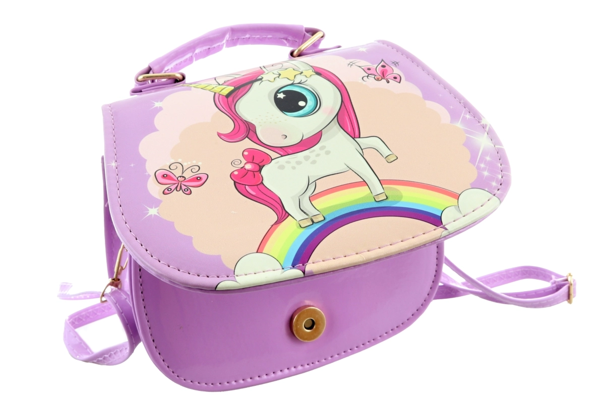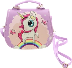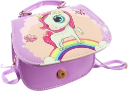 Vijolična torbica z motivom samoroga. Torbica ima znotraj 1 pregrado. Zapiranje na pritiskač. Mere torbice približno 18 × 14 × 8 cm. Starost 3+