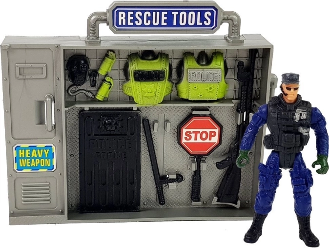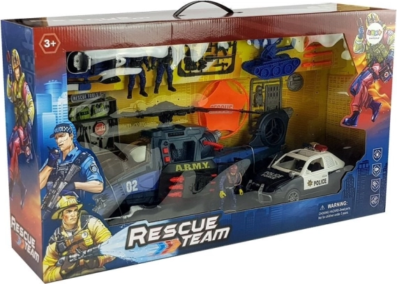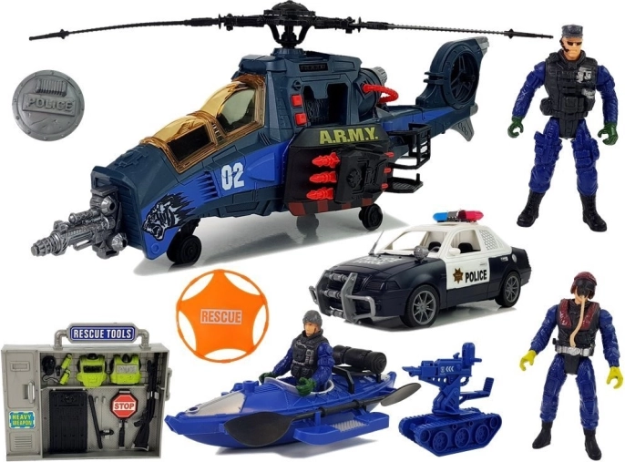 Ta celovit policijski set otroke popelje v svet intervencij. Velik helikopter z funkcijskimi gumbi, ki sprožijo svetlobne in zvočne učinke, ustvari vzdušje prave misije, medtem ko policijski avto in kajak razširita možnosti igre na kopnem in na vodi. Za vse poskrbita figurica policista in tematski dodatki.