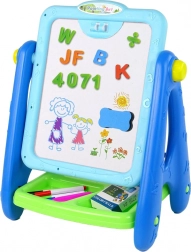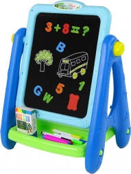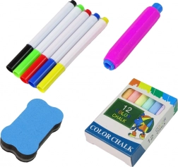 V kompletu najdete celoten paket: samo tablo z nogicami, 5 različnih barvnih flomastrov (moder, rdeč, rumen, zelen, črn), praktično gobico za brisanje in tudi 12 barvnih kred (po 2 vsake barve) za pisanje na črno stran. Ovitek za krede dodatno omogoča risanje, ne da bi si umazali roke, komplet magnetov s črkami, številkami in znaki pa nudi dinamično in interaktivno učenje.