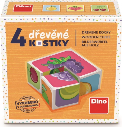 Dino lesene kocke Sadje 4 kos: 6 slik iz 4 kock, smrekov les, varne in trpežne. Spodbujajo motoriko in domišljijo otrok od 3. leta dalje.