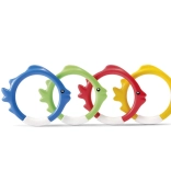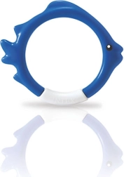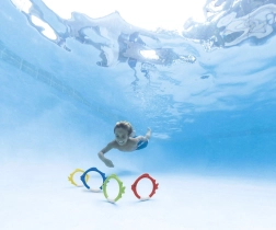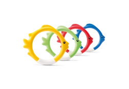 Komplet potapljaških obročev Intex v obliki rib je idealen pripomoček za igrivo učenje potapljanja. Zaradi izrazitih barv in stabilne postavitve na dno bazena otroci cilj zlahka najdejo ter z veseljem vadijo zadrževanje sape in orientacijo pod vodo.