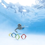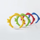 Zabaven komplet štirih potapljaških obročev v obliki ribic za otroke od 6 let. Obroči v barvah modra, rdeča, zelena in rumena se po vrženju v vodo stabilno postavijo na dno, kar motivira k treningu potapljanja in izboljšuje plavalne veščine. Izdelani so iz mehkega in varnega materiala za enostaven oprijem.