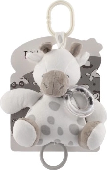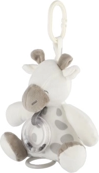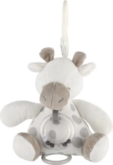 Žirafa je izdelana iz mehkih, prijetnih materialov in ima pomirjujoč glasbeni mehanizem, ki po potegu zaigra nežno melodijo. Nevtralna sivo-bela izvedba se poda v vsako otroško sobico ter spodbuja miren spanec in občutek ugodja.