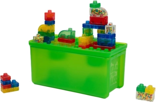 Set Jelly Blox Stash & Stack vsebuje prikupno škatlico, v katero gre do 30 mehkih senzoričnih blokov.