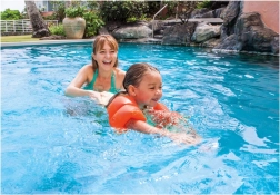 Z zahvaljujoč tem rokavčkom lahko otroci uživajo v veselih trenutkih v vodi, medtem ko se pod nadzorom učijo plavati, kot prikazuje podoba sprostitve ob bazenu.