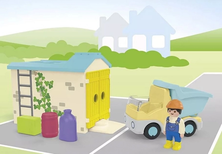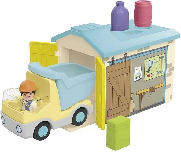 - Garaža s ploščo za sortiranje, tovorno vozilo s kljuko in nagibno keso, figurica delavca, kosi tovora (vreča, škatla, sod)