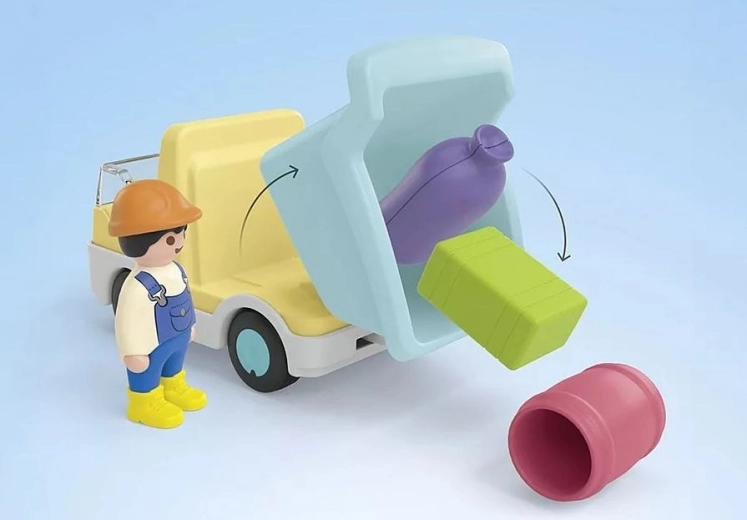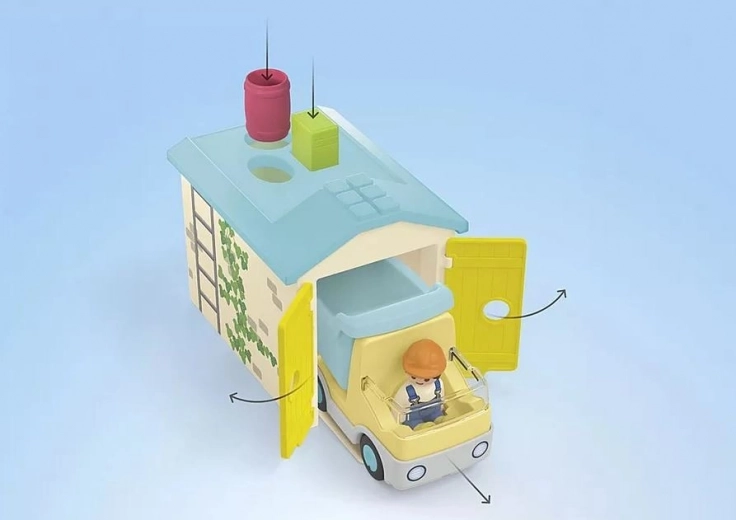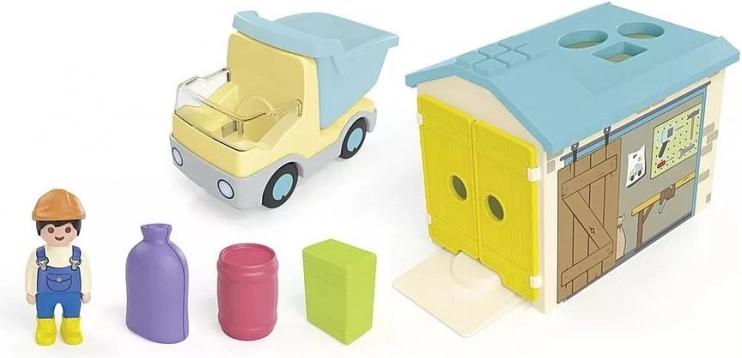 Odkrijte svet gradnje s tem igrivim kompletom za najmlajše! Tovorno vozilo z garažo in funkcijo sortiranja oblik razvija fino motoriko, logično razmišljanje in koordincijo oko–roka. Otrok lahko naloži vrečo, škatlo in sod skozi prave odprtine v garaži, posadi delavca v kabino in se odpravi na “gradbišče”. Po končanem delu se tovor zlahka izsuje z nagibno keso.