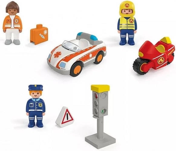 Ta igrivi set za male raziskovalce prinaša svet reševalcev neposredno v otroško sobo. Otroci uživajo v realističnih prizorih z zdravnico, policistom in gasilcem na motorju, medtem ko se učijo pravil cestnega prometa s pomočjo delujočega semaforja s spremembo luči.