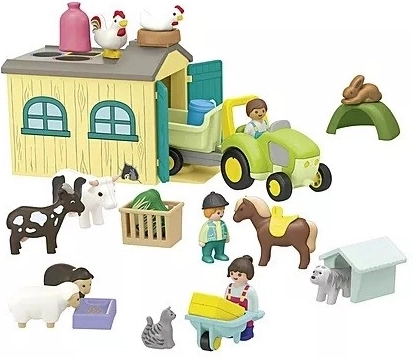 Traktor s kljuko in prikolica z odpirajočo bočno stranico zmoreta vsako nalogo. Odrasla figurica lahko vozi samokolnico, otrok se lahko usede na ponija in skupaj poskrbita za živali in dvorišče. Set je mogoče kombinirati z drugimi kmečkimi seti za še večji svet domišljije.