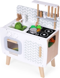 Dovolite otrokom kuhati kot odrasli. Lesena kuhinjica ECOTOYS združuje trpežne materiale, brezčasni retro videz in funkcionalne detajle, ki podpirajo igro vlog in smiselno igro. Zahvaljujoč umirjenim barvam se odlično poda v otroško sobo ali igralnico.