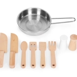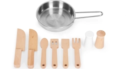 Stojalo za nože, kljukice za pripomočke in komplet dodatkov (noži, pribor, lopatke, sol/poper, kozica) učijo otroke reda in razvijajo motoriko.
