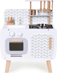 Kuhinjam v umirjenih barvah iz kakovostnega lesa brez ostrih robov se lepo poda v vsak otroški sobi in nudi varno okolje za ustvarjalno igro.