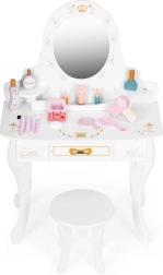 Vsebuje veliko dodatkov, ki bodo zagotovo razveselili vsako malo gospodično. Komplet je pripravljen tako, da se lahko otrok igra vlogo vizažistke, manekenke ali princeske. Skozi igro bo otrok razvijal svoje ročne spretnosti in domišljijo ter imel priložnost naučiti se osnov ličenja.