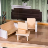Del kompleta je tudi komplet 15 kosov lesenega pohištva, ki ga je mogoče poljubno premikati in preurejati brez omejitev.